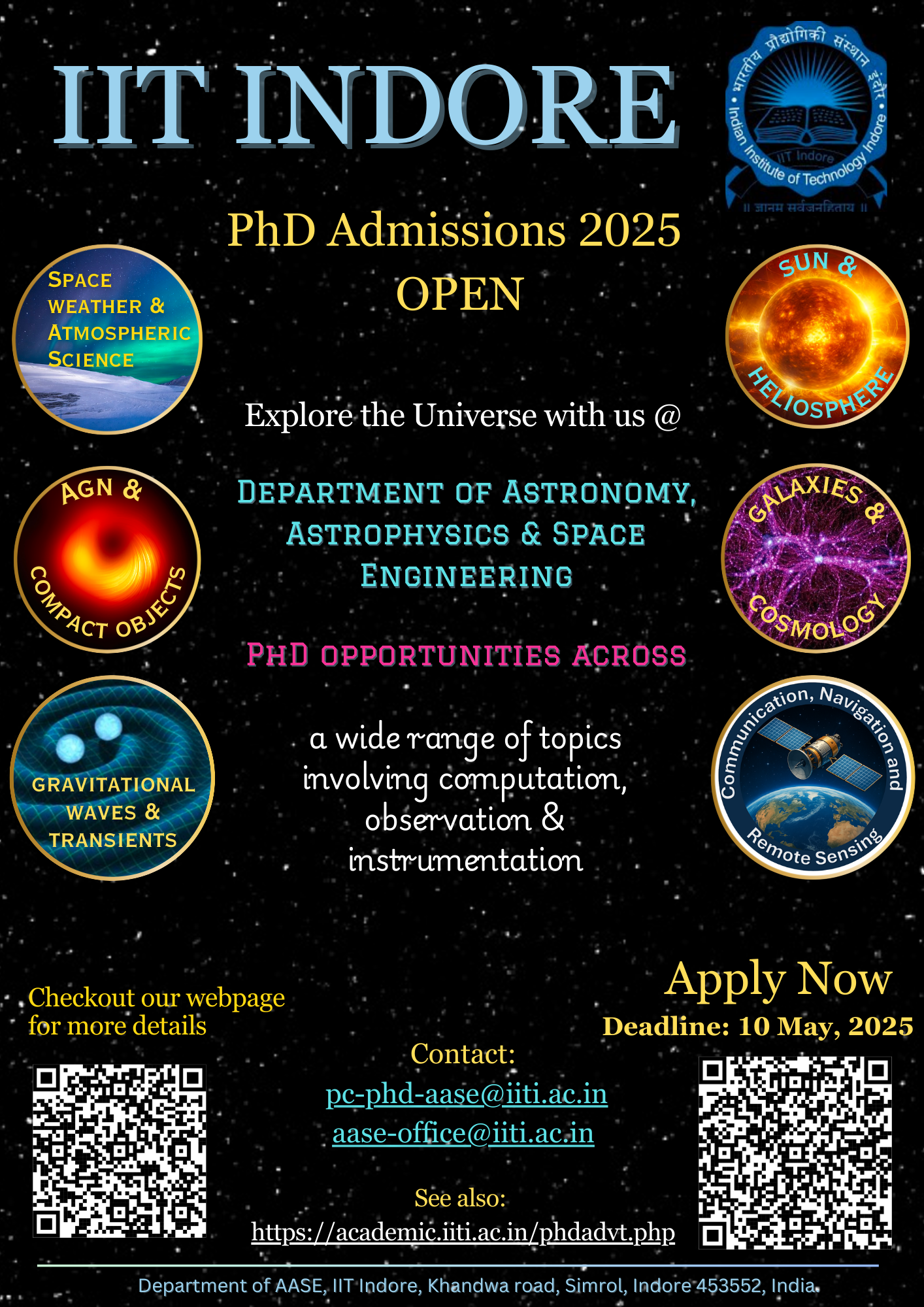 | Job Title: Advertisement for Admission to Ph.D. Programme, Department of Astronomy, Astrophysics and Space Engineering, IIT Indore Job Category(s) : PhD Job Description : Applications are invited from highly motivated and research-oriented candidates for admission to Ph.D. Program in the Department of Astronomy, Astrophysics and Space Engineering (DAASE), IIT Indore. Application details and the PhD advertisement poster can be found here: https://drive.google.com/file/d/1wClS3rlxwei0-QLhGz_1EDu9IL9HBRGs/view?usp=sharing Application deadline : 2025-05-10 Institutional URL with the announcement : https://sites.google.com/view/daase/opportunities?authuser=1 Announcement Brochure/Poster/Notification : IIT Indore.png Name of the Contact Person : Dr. Priyanka Singh Affiliation of the Contact Person : Assistant Professor Email of the Contact Person : psingh@iiti.ac.in Other Remarks : Applicants are strongly advised to visit the departmental website (https://aase.iiti.ac.in/). |