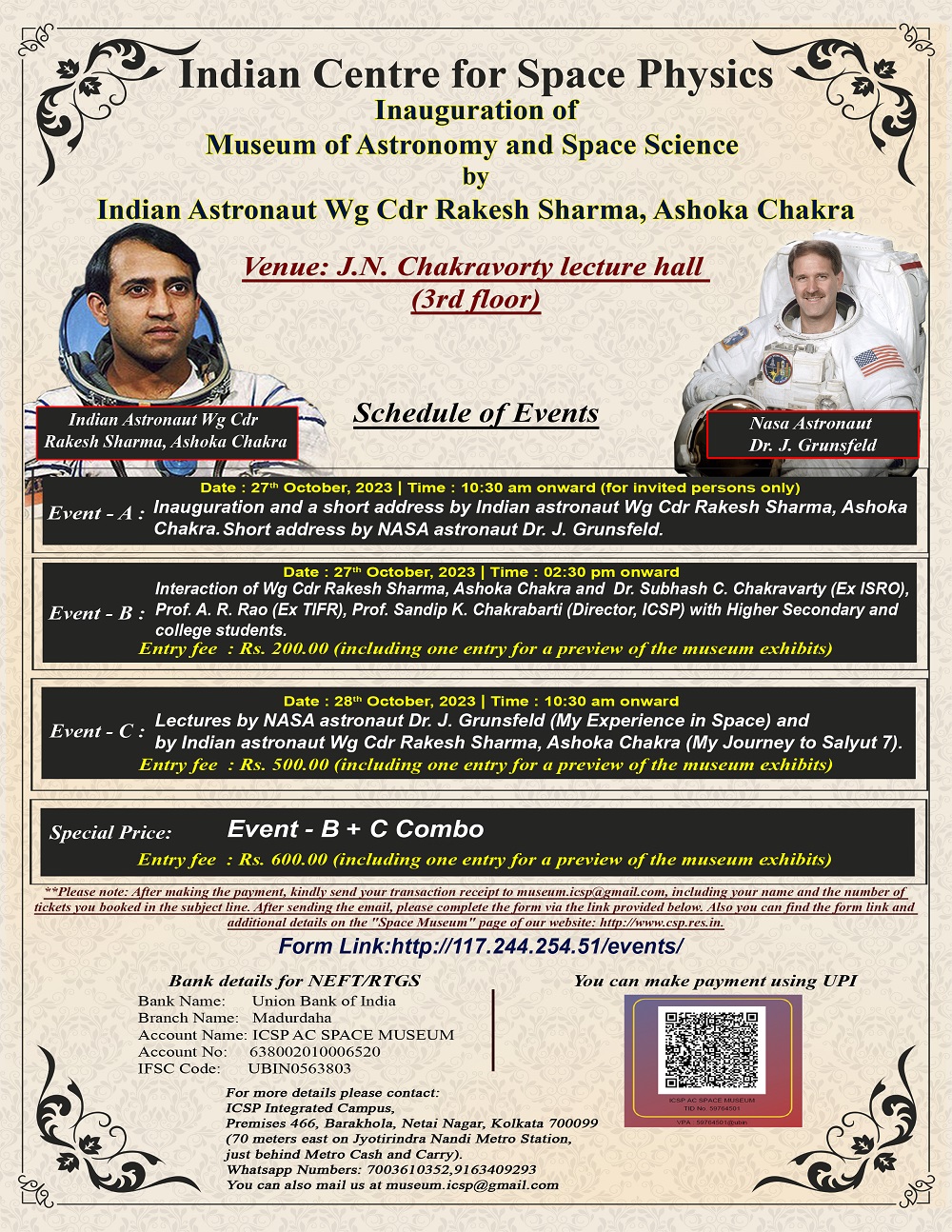 The Museum of Astronomy and Space Science, located in the Integrated Campus building of the Indian Centre for Space Physics will be inaugurated by Indian Astronaut Wing Commander Rakesh Sharma, Ashok Chakra (Retd) on 27th of October, 2023. There are over 1200 exhibits. We will have two days of packed events as attached. There will be talks by NASA Astronaut Dr. John Grunsfeld and Mr. Sharma on both days. Astronomers may be interested in this event.