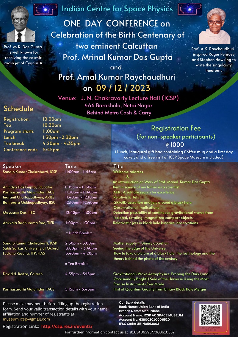 Dasgupta, Nature 1953) and Prof. Amal K. Raychoudhuri (Raychoudhuri Eqn.). The Venue is the newly inaugurated J.N. Chakraborty Auditorium at the ICSP integrated campus. All are invited to participate.
