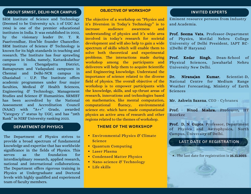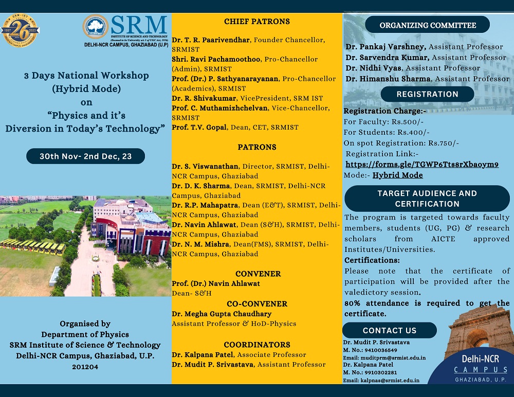 SRMIST, Delhi NCR campus feels happy to organize a 3 Days workshop on "Physics & its Diversion in today's Technology" in hybrid mode from 30th Nov - 2nd Dec 2023. The last date for registration is 25th Nov 2023.