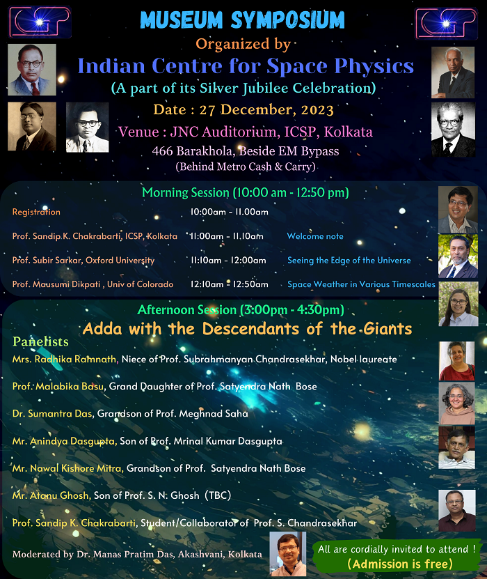 We are going to arrange a Museum Symposium at the Indian Centre for Space Physics, (ICSP) Kolkata on 27 December 2023. In this event, descendants of some Great Indian astrophysicists will join and reminisce about the Giants. Here I attach the Poster for the same. This is complemented by a visit to the Astronomy and Space Science Museum at ICSP, Kolkata.