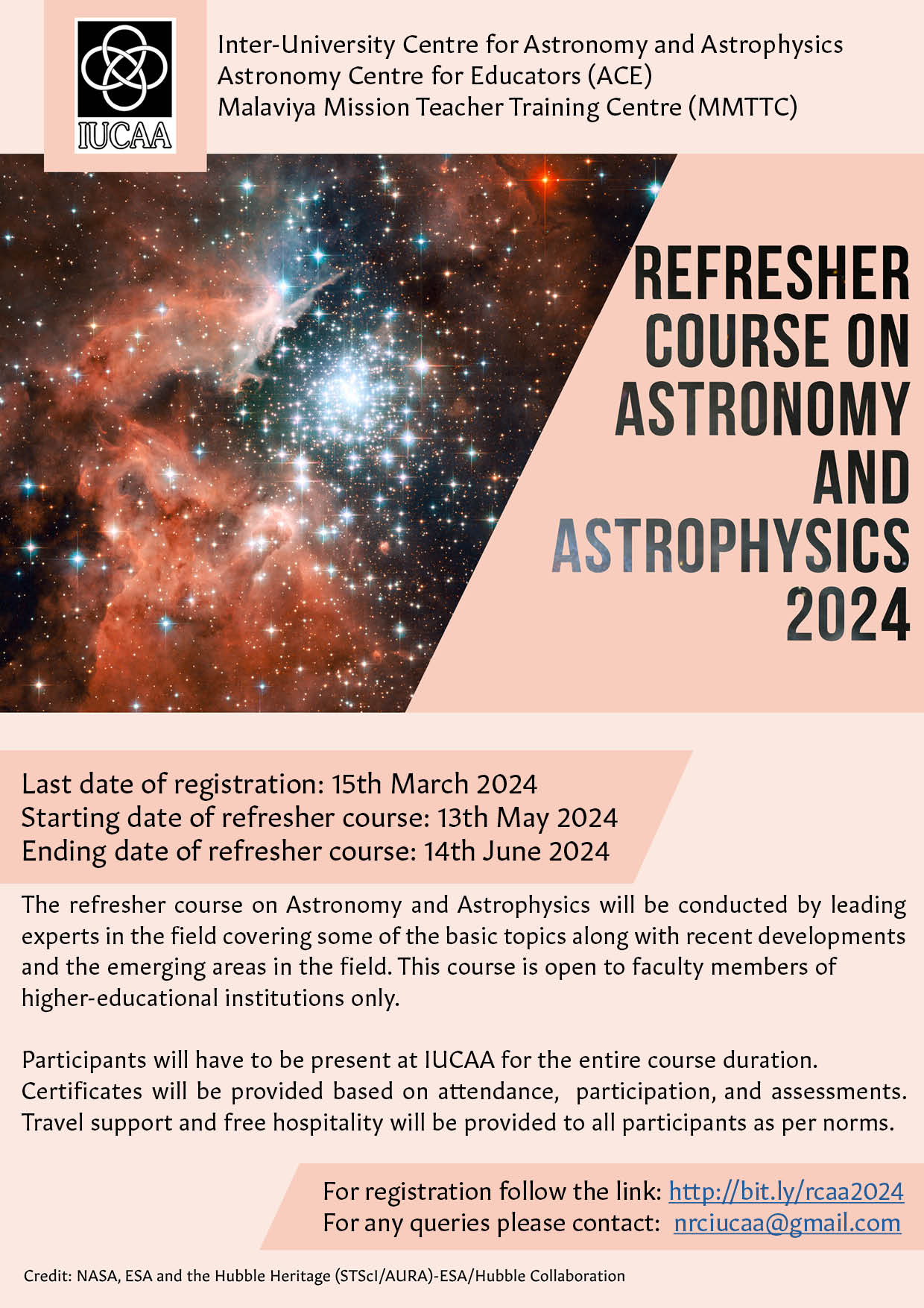 Greetings. We are pleased to announce the Refresher Course on Astronomy and Astrophysics to be held at site in IUCAA from the 13th of May to the 14th of June 2024. The course is open to faculty members of all higher educational institutions in the country.
