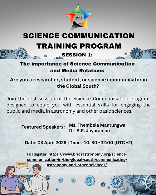 BRICS Astronomy, in collaboration with science communicators and organisations across BRICS and African countries, is launching a series of Science Communication Training Sessions.
